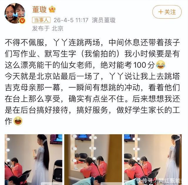 4月7号晚上看完《在远方·在这里》首演,我坐在观众席第三排,没看字幕,光盯着后台通道口。小酒窝出来的时候脸还蹭着粉,裙子上沾了点灰,但笑得特别松快。佟丽娅没站在她身后,是蹲着的,手搭在她腰侧,两人一起转了个圈——不是摆拍,是真顺,像练过一百遍又像第一次。       散场后刷到后台视频,小酒窝一边卸睫毛一边听写“锡伯族”的“锡”字。佟丽娅拿签字笔在便签纸上写,笔尖漏墨,把“金”字旁染黑了一块。旁边老师递来保温杯,说刚批完她数学作业,错三道,改两道,第三道她自己擦掉重算。没人喊“佟老师”,都叫“丫丫”。       我看她在环球影城门口蹲着教拼音,身后是变形金刚海报,小酒窝踮脚指着“b”说像“小兔子耳朵”。佟丽娅点头,顺手把孩子滑下来的发卡别回去,手指没停,继续写“p”的笔顺。那会儿人不多,但有个穿校服的女生举着手机拍,拍完直接发班群,配文:“咱班朵朵妈真人版家教老师。”       董璇那天也在。不是“干妈”那种正式出镜,是蹲在化妆间门外剥橘子,剥完塞给小酒窝一瓣,自己留下三瓣。她手机屏亮着,是幼儿园老师发来的语音:“小酒窝作业本全对,写字比朵朵还工整。”她听完没回,只把橘子皮收进袋子里,说:“明早送朵朵上学,顺路带她练跳绳。”       有人说她俩是闺蜜,我说不像。闺蜜会互相吐槽老公,可她们从不提前夫。有次小酒窝发烧39度,佟丽娅凌晨两点抱着人冲医院,董璇同时从另一家医院赶过来,手里拎着退烧贴和退热栓。挂号单上写佟丽娅是监护人,缴费单上董璇签了字——不是代签,是并排签的,中间空了一指宽。       小酒窝舞台演的是锡伯族小孩,但跳舞时会下意识扭脖子,这个动作佟丽娅没有,董璇也没有。后来问朵朵,她说:“小酒窝扭脖子是因为她摔过一次,脖子疼,跳舞就晃着找舒服位置。”原来不是学谁,是身体自己记住了怎么活。       网上有人说“佟丽娅靠女儿翻红”,我看不懂这逻辑。她4月5号登台演母亲,演哭戏没用眼药水,演到第二场咳嗽两声,自己把麦调低两格;4月6号去小学开家长会,坐最后一排,记笔记用铅笔,擦了两次;4月8号补拍广告,导演喊卡,她第一句是问小酒窝作业写完没。       老师说朵朵和小酒窝同班,但不同组。朵朵坐前排,小酒窝坐窗边——老师特意安排的,说她容易分心,看窗外绿树比看黑板久。可上次期中考试,她数学比朵朵高两分,卷子背面画了只歪脖子小鹿,鹿角上挂着拼音。       佟丽娅以前总被问“离婚后怎么养孩子”,现在没人问了。问的是“小酒窝作业本能不能发个图”。有人翻她俩微信聊天记录截图,佟丽娅发了个作业本照片,配字:“老师说字太小,让她重抄。抄完我给她盖章。”下面回:“章呢?”她回:“刚刻好,‘丫丫监印’,红泥。”       小酒窝没上过任何艺考班,也没提前学奥数。她假期才演戏,平时放学先写作业,写完跳十分钟舞,跳完吃水果。有次她跳着跳着停住,说:“妈妈,我胳膊酸,但不累。”佟丽娅摸她肩膀,没说话,掏出手机放了一段哈萨克族冬不拉音频,音量调很小。       那天晚上我路过小区儿童游乐区,看见董璇推秋千,佟丽娅坐在长椅上看书,小酒窝在沙坑里挖坑,朵朵蹲旁边递铲子。没人拍照,也没人说话。沙子漏下来,像时间流下去,很慢,但没停。       小酒窝不是“别人家的孩子”。她是那个作业本上画小鹿、发烧还背诵《敕勒歌》、谢幕时主动拉妈妈手一起跳的普通小孩。佟丽娅也不是“逆袭”或“翻身”,她就是丫丫,一个教孩子写字、陪孩子发烧、在演出间隙蹲着剥橘子的女人。       董璇也一样。       她们三个,就坐在那儿。